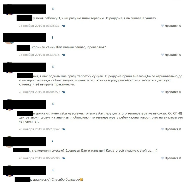 «У меня ребенку 1,2 [года], ни разу не пили [антиретровирусную] терапию. В роддоме я выливала в унитаз. <…> Как родила, сразу таблетки сунули. <…>
