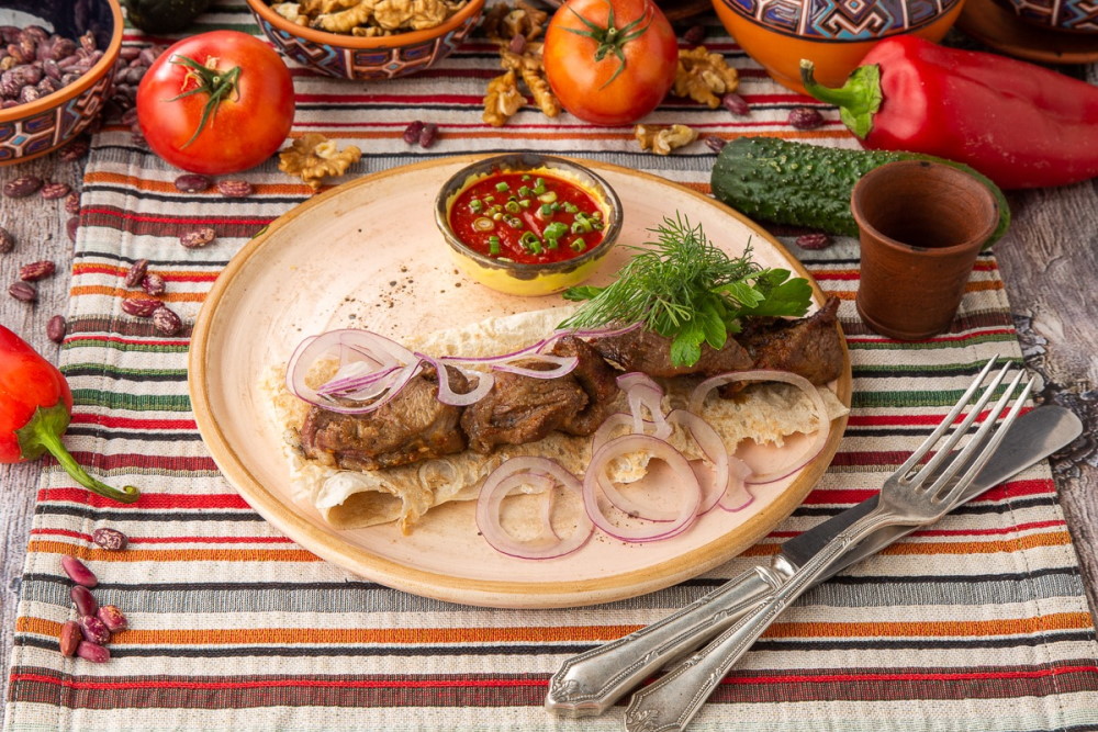Гостям заведения предлагают традиционные блюда грузинской кухни: сациви, лобио, хинкали, хачапури, харчо, чахохбили. На кухне используют специи и приправы из Грузии, многие позиции готовят по семейным рецептам.
