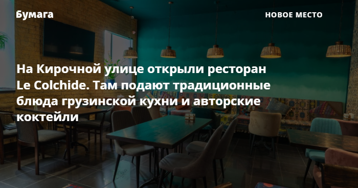 На Кирочной улице, 2 открыли грузинский ресторан Le Colchide, рассказал «Бумаге» управляющий заведением Георгий Иванов. Вместе с ним проектом работают инвесторы и ресторатор Гоча Тусиашвили, создатель «Пиросмани» на Петроградской стороне.