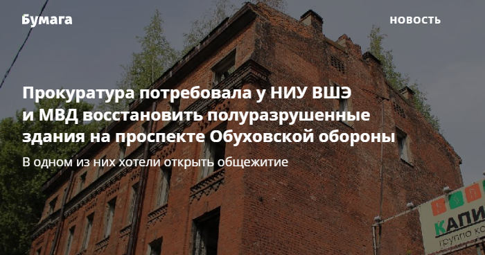 Прокуратура потребовала у НИУ ВШЭ и МВД восстановить полуразрушенные здания на проспекте Обуховской обороны. В одном из них хотели открыть общежитие