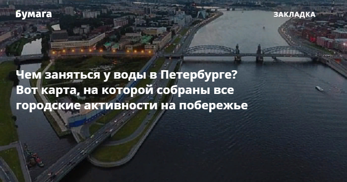Сайт и карту бюро создало по итогам своего исследования водного потенциала Петербурга, рассказали «Бумаге» в MLA+. «У нас есть больше [активностей], чем кажется. Хотя это совершенно не бросается в глаза», — сказали в бюро.