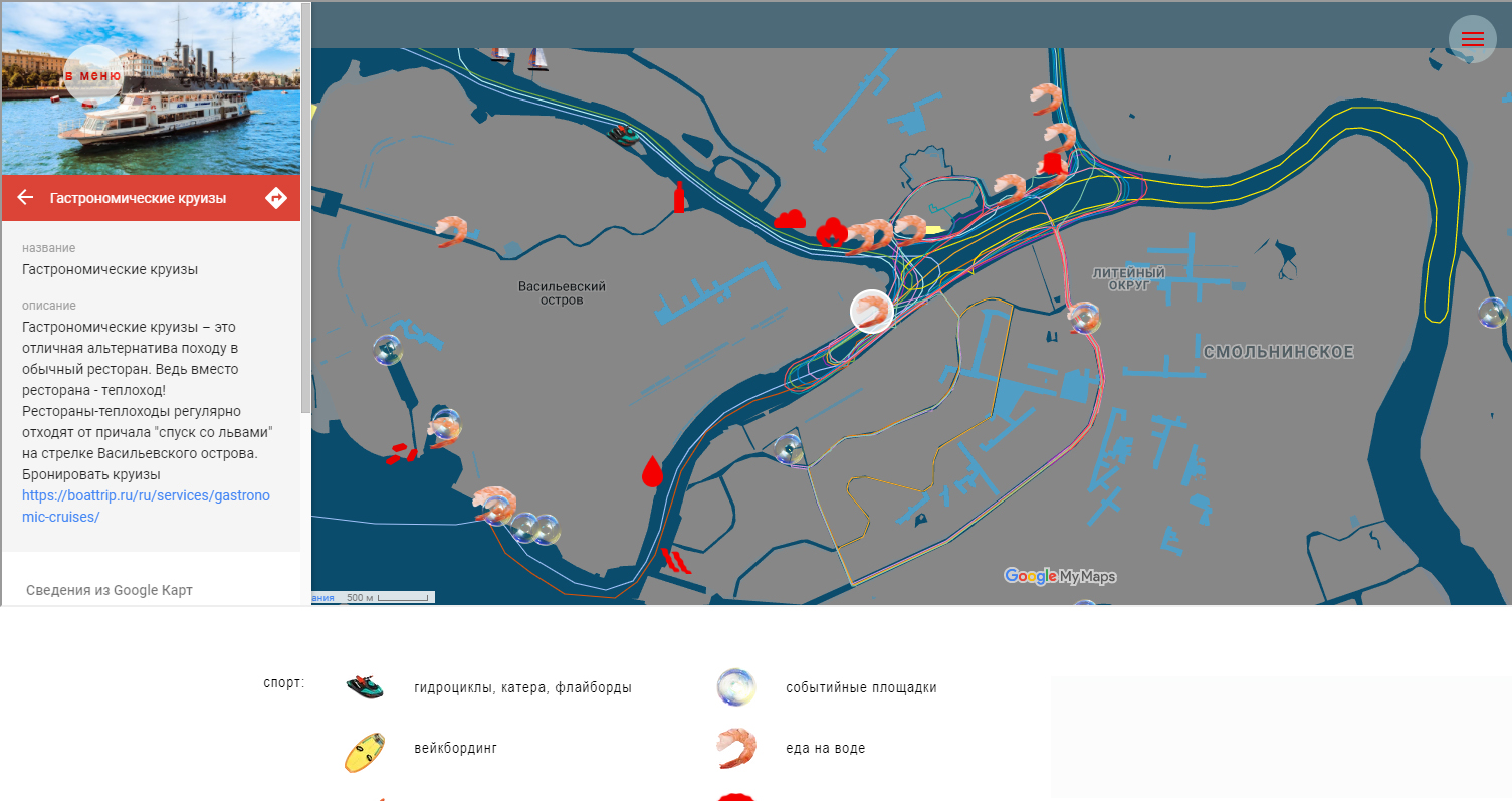 Архитектурное бюро MLA+ создало сайт «Нераскрытый Петербург. Вода», посвященный активностям на воде в Петербурге, и нанесло эти активности на карту.