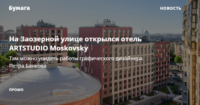 Рядом с метро «Фрунзенская» открылся трехзвездочный отель ARTSTUDIO Moskovsky. Одна из его особенностей — творческая составляющая. Это не только место для проживания, но и арт-пространство.