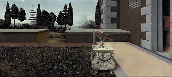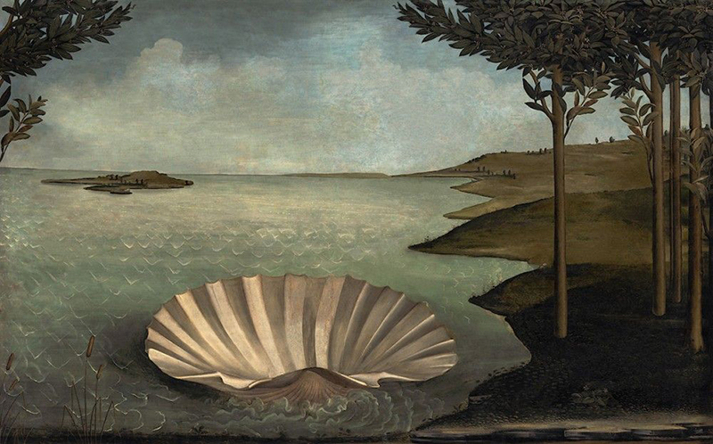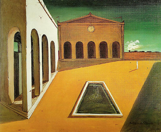 Джорджо де Кирико. Наслаждение поэзии. 1914 С уходом свиты Венеры оставшаяся на берегу раковина приобретает значение единственного персонажа картины, как преувеличенные предметы сюрреалиста Магритта. У бельгийца есть ряд картин, пейзажи на которых помещены в форму силуэта джентльмена в шляпе. Получается ситуация, когда человека нет, но есть напоминание о нем — пустота, прорезь в некой стене в форме человеческой фигуры, открывающая вид на океан или лунный сад. В этом случае силуэт работает как след, означающий отсутствие. Не природа сама по себе, а природа, лишенная присутствия человека. Примерно так же работает зримая пустота на картинах Баллестера — как знак отсутствия.