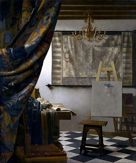 © Предоставлено пресс-службой музея «Новый Иерусалим» Хосе Мануэль Баллестер. Мастерская художника. С оригинала Яна Вермеера «Искусство живописи». 2008 Постинтернет-искусство — не живопись и не требует носителя. Баллестер — художник «старой закалки», его работы напечатаны на холсте, но при этом сохраняются не все тонкости мазков и лессировок. Автор не делает акцент на мастерстве гениев прошлого — его эксперимент заключается в изучении фона, а не живописной поверхности. Уходят не только люди, но и аура, о которой пишет Беньямин, — ощущение уникальности картины, что перед нами. Сухой остаток — место действия, где след выступает знаком отсутствия. Однако увидеть в полном размере искусство, ранее виденное в интернете, до сих пор остается «музейным экспириенсом» во всех смыслах. Зрелище, атмосфера, участие: можно также сделать фото на фоне опустевшей картины, будто ты Венера или инфанта, а детям на мастер-классах предлагают дорисовывать картины по-своему.