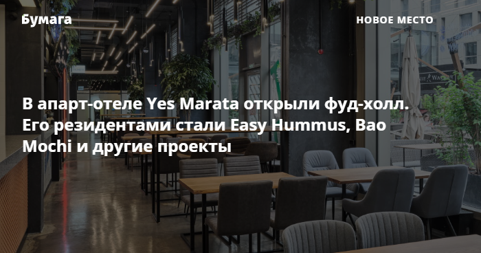 В апарт-отеле Yes Marata на Социалистической улице, 21 открыли фуд-холл, сообщили «Бумаге» представители проекта. Его резидентами стали восемь гастрономических концепций с израильской, итальянской, азиатской и грузинской едой.