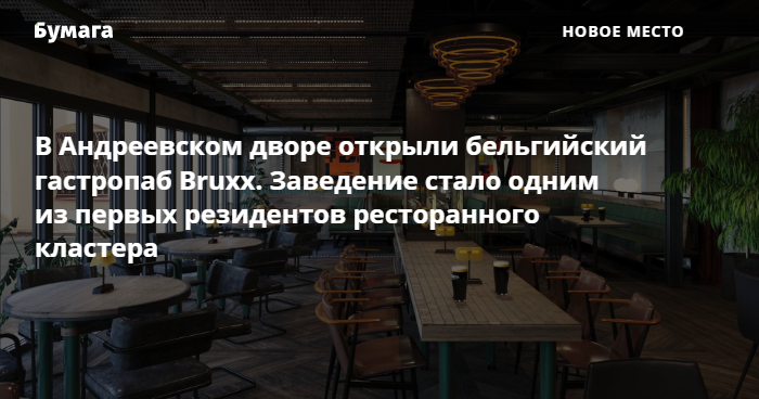 В Андреевском дворе на Большом проспекте Васильевского острова, 18А открыли бельгийский гастропаб Bruxx, сообщили «Бумаге» представители заведения. Bruxx стал одним из первых резидентов ресторанного кластера в этой локации, проектом занимается команда Italy & co. В 2019 году первый паб под этим брендом открыли в Москве.