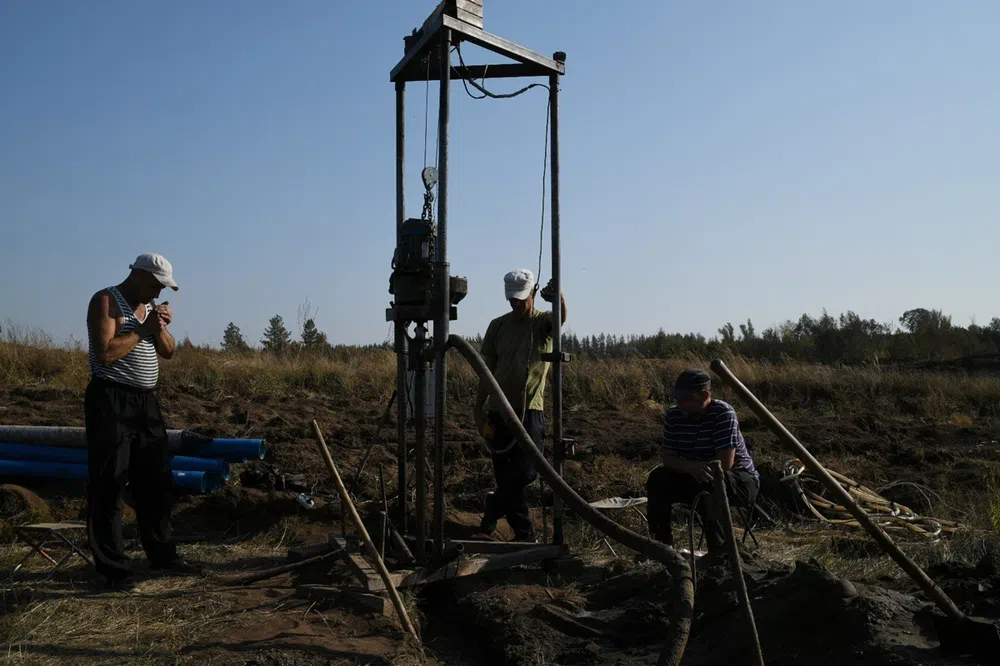 Четверо мужчин в кепках и панамах понуро сидят на траве, перед ними в земле мутная, грязная вода. Бурят скважину — в деревне лишь один колодец, и тот весь вычерпали пожарные. Питьевой воды в деревне больше нет. Бурильщики приехали из Борского.