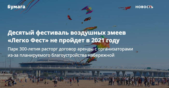 Фестиваль воздушных змеев «Легко Фест», который должен был пройти в парке 300-летия Петербурга в сентябре 2021 года, отменили из-за работ по благоустройству на набережной. Об этом в своем фейсбуке сообщила Александра Калачева, организовывавшая мероприятие.