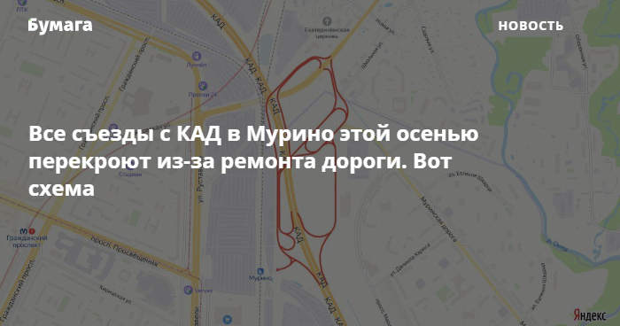 Этой осенью из-за дорожных работ поочередно перекроют все съезды с КАД в Мурино. Об этом сообщает пресс-служба ФКУ Упрдор «Северо-Запад».