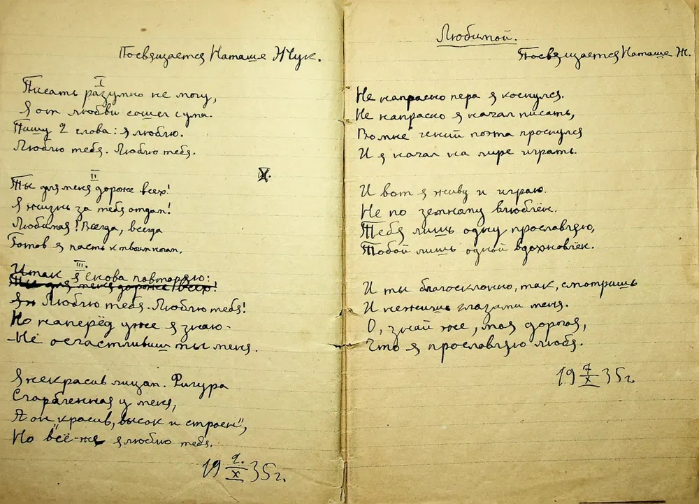 Все 15 стихотворений написаны на протяжении октября, ноября и декабря 1935 года, то есть в первом учебном полугодии. И все — посвящены одной девочке-однокласснице — Наташе Жук (лишь в паре последних к адресатам добавился еще и некий «Л.С.», — предположительно, тот самый загадочный третий, которого Сеня считал своим счастливым соперником).