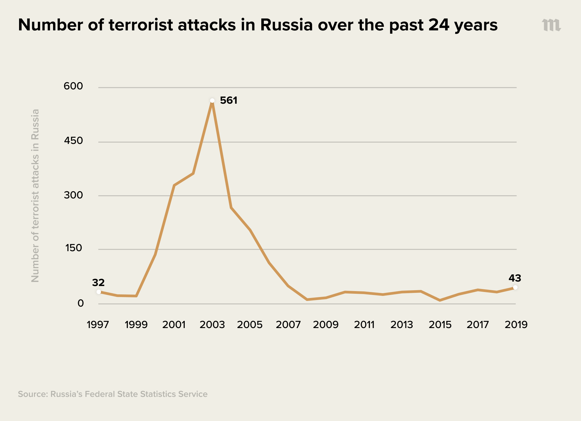 What’s happened to the number of terrorist attacks in Russia over the past 25 years?