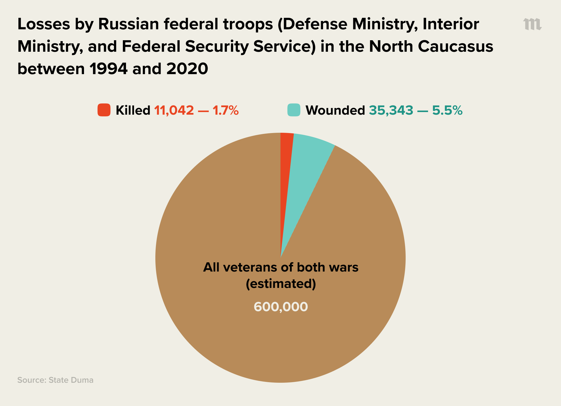 All we have are rough estimates of the total number of veterans. For example, 600,000 people had participated in combat with Russia’s federal forces by 2009, when Moscow formally ended its counterterrorism operation in the North Caucasus, but troops remained in the region afterward, as well.