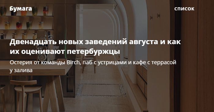 В августе «Бумага» выбрала двенадцать новых петербургских кафе, баров и ресторанов, узнала, что там готовят, есть ли доставка и что о местах говорят посетители и эксперты.