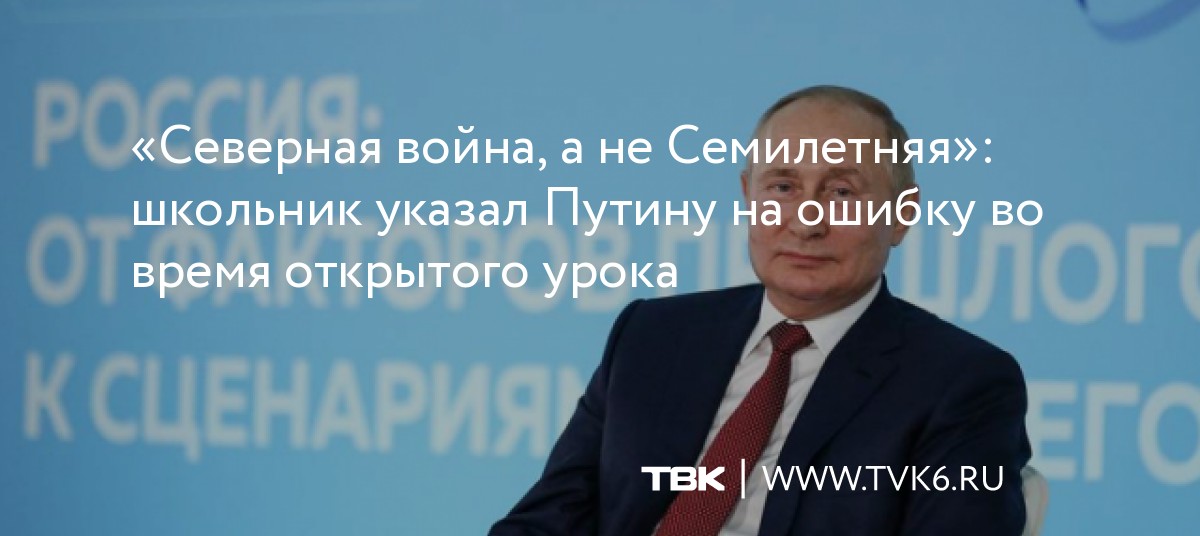 Подросток добавил, что Северную войну Петр Первый вел 21 г. Путин признал ошибку и поблагодарил за исправление.«Не сочтите за мою как бы... В общем, это называлось не Семилетняя война, а просто Северная война», — сказал Никанор.
