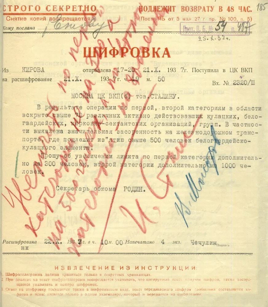 Хотя, как правило, подобные решения оформлялись постановлением Политбюро ЦК ВКП(б). Обычно сколько просили, столько и давали. Но были и примеры сталинской «щедрости». Вот один из них, весьма показательный. Первый секретарь Кировского обкома Михаил Родин обратился с просьбой об увеличения «лимита» по первой категории на 300 человек, а по второй — на 1000. Сталин почему-то решил по-своему. Ему показалось мало, и резолюция гласила: «Увеличить по первой категории не на 300, а на 500 человек, а по второй категории — на 800 человек».