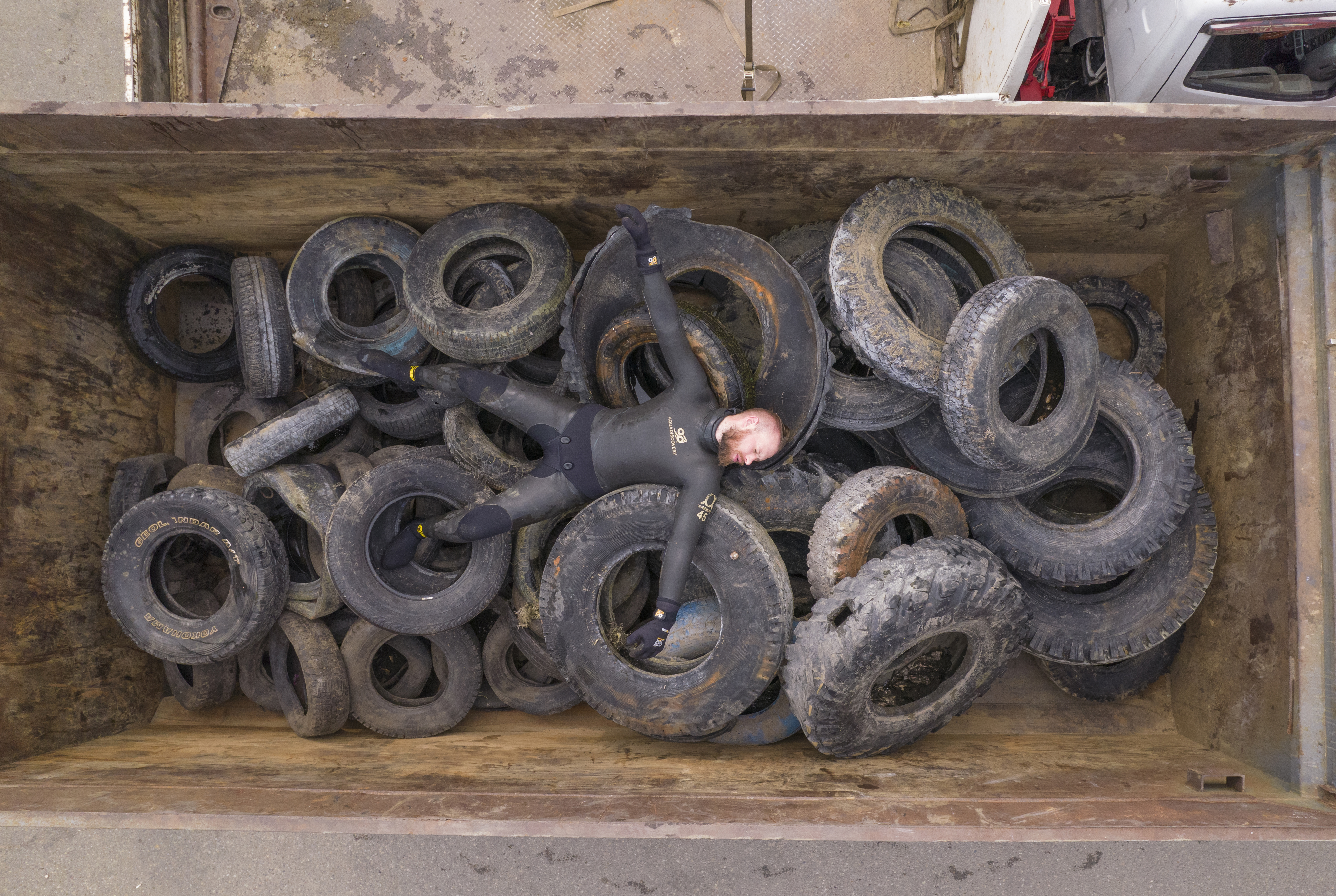 Раньше я их выдергивал вручную – это невероятно тяжелое дело, особенно с учетом того, что я ныряю на задержке дыхания. Без баллонов с кислородом. Снаряжение – оно хорошо, когда нужно долго идти по глубине и собирать мелкий мусор в мешок. А с огромными шинами нужно много и часто нырять, оперативно переговариваться с пилотом гидроцикла – тут лучше на своем кислороде. Выдирая покрышку из грунта, мощный гидроцикл на скорости провозит ее сквозь толщу воды, она заодно очищается от песка, ила, слизи, водорослей и подплывает к берегу уже чистой.