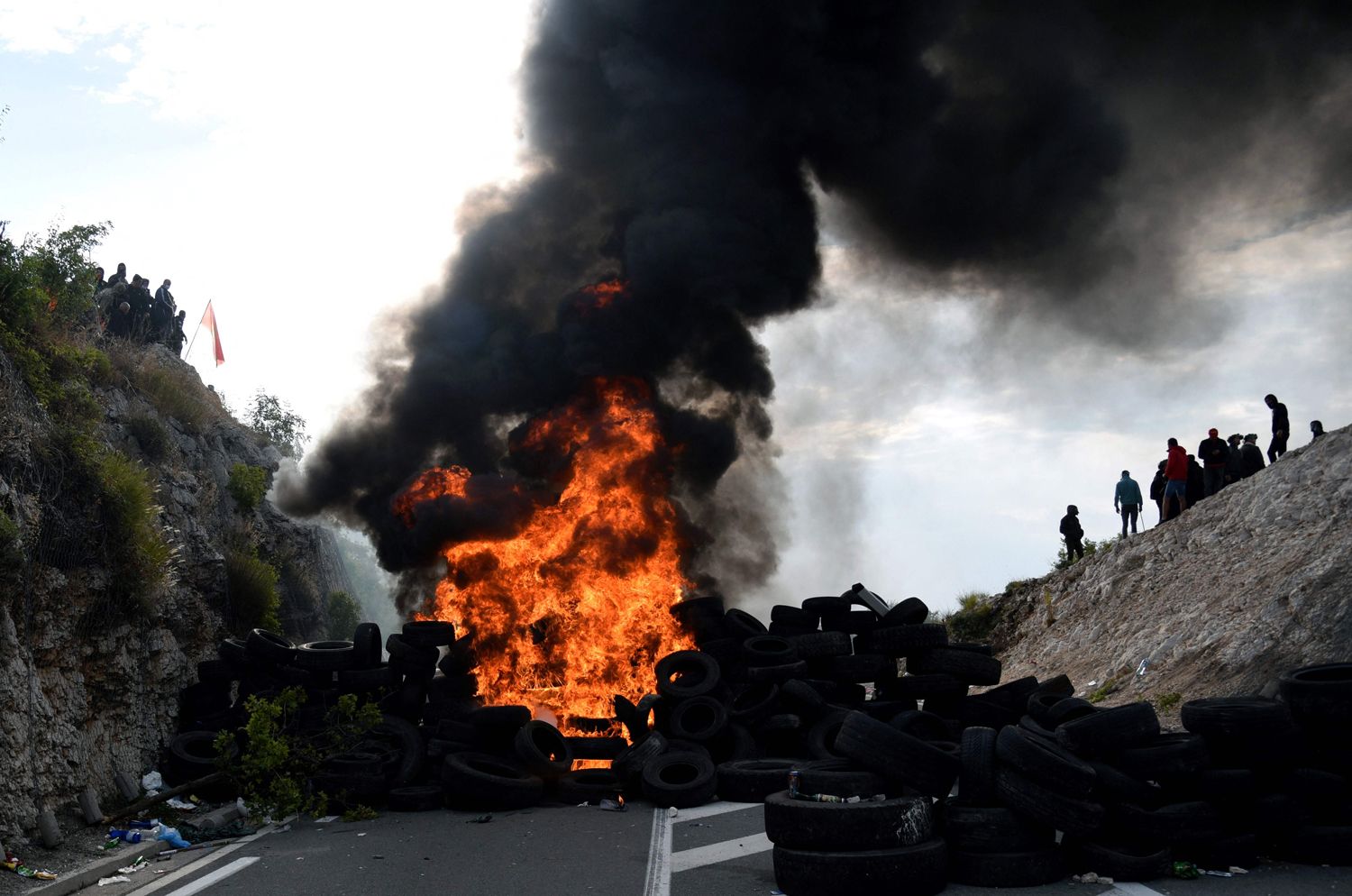 Демонстранты жгут шины на баррикаде на въезде в Цетине, 5 сентября 2020 года