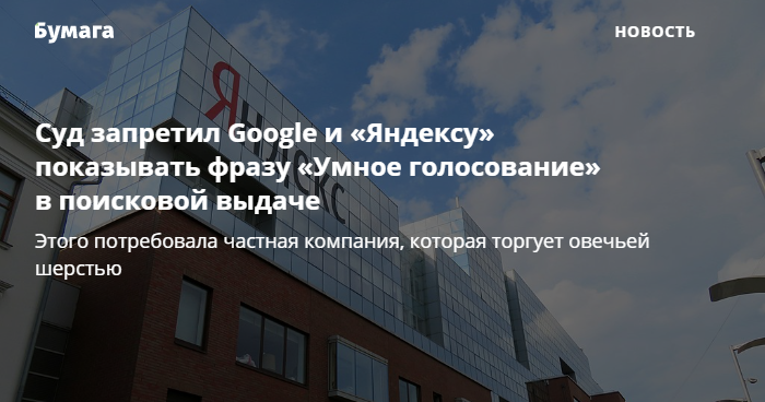 Суд запретил Google и «Яндексу» показывать фразу «Умное голосование» в поисковой выдаче. Этого потребовала частная компания, которая торгует овечьей шерстью