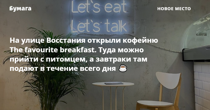 На улице Восстания, 37–39 открыли кофейню The favourite breakfast, рассказали «Бумаге» основательницы проекта. Небольшое заведение работает с 8:00 до 22:00 по будням и с 9:00 до 22:00 по выходным, завтраки там подают в течение всего дня.