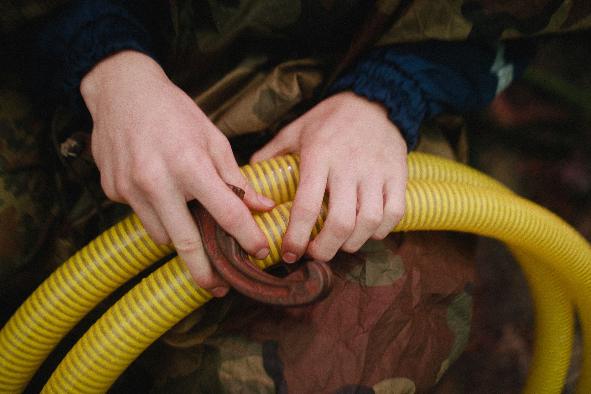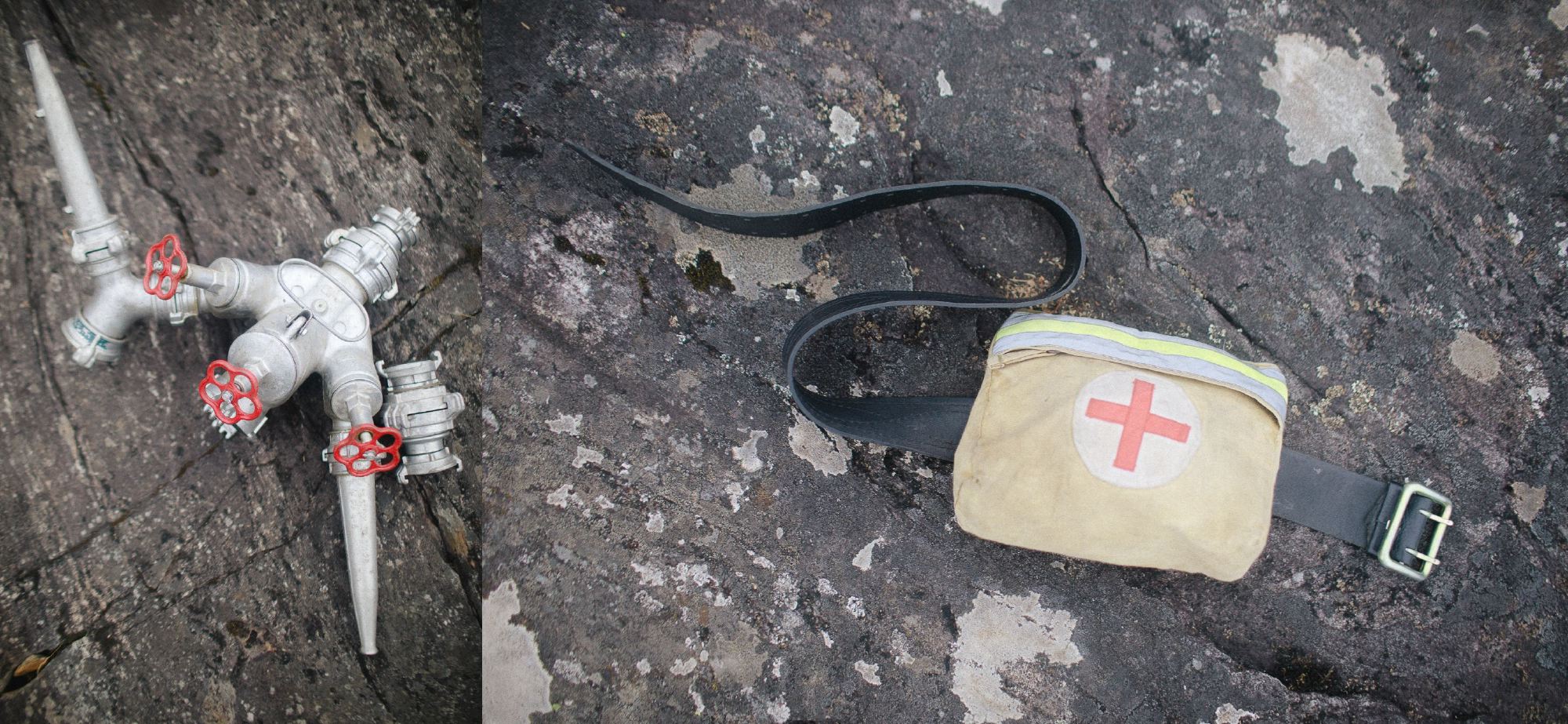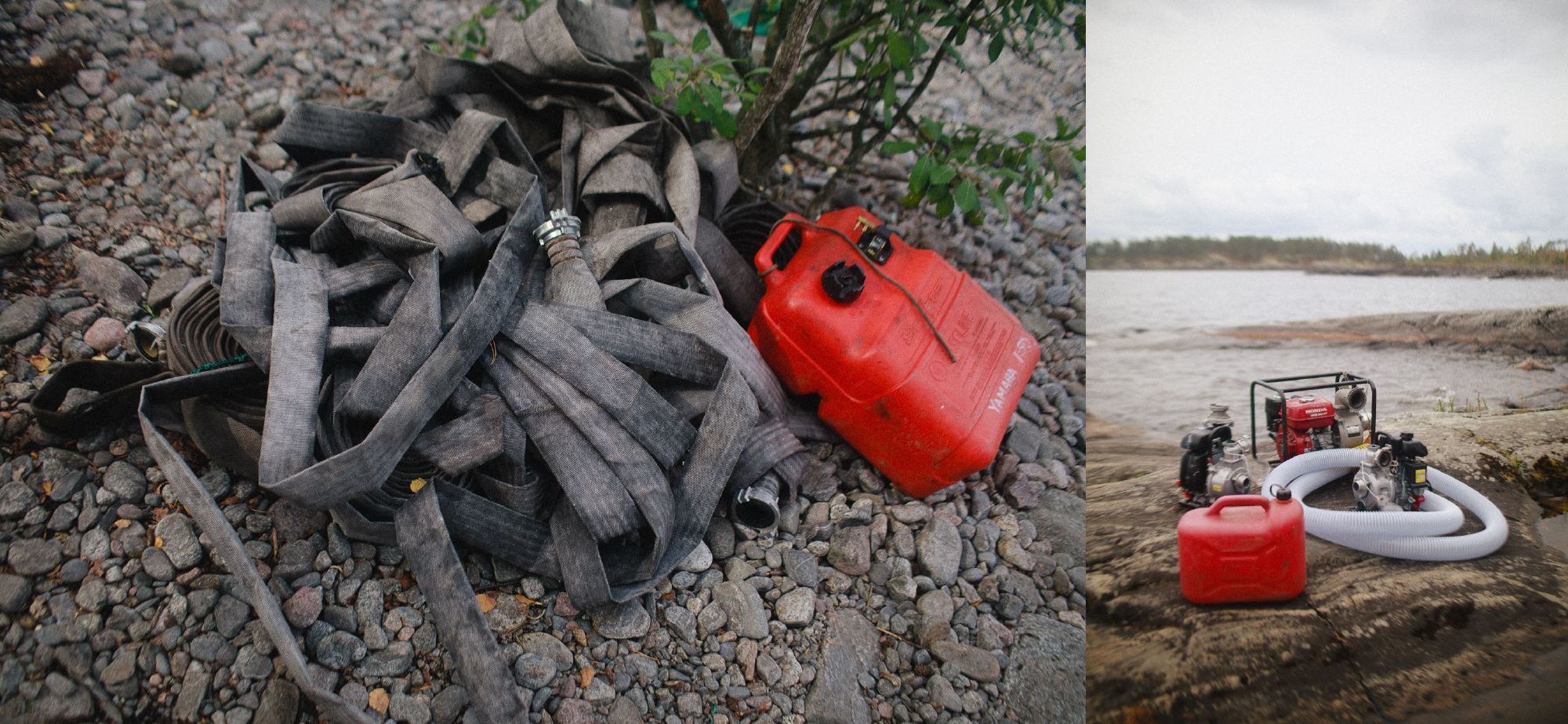 Пожарные рукава, отложенные для ремонта. Мотопомпа, подготовленная к проведению занятий с новичками