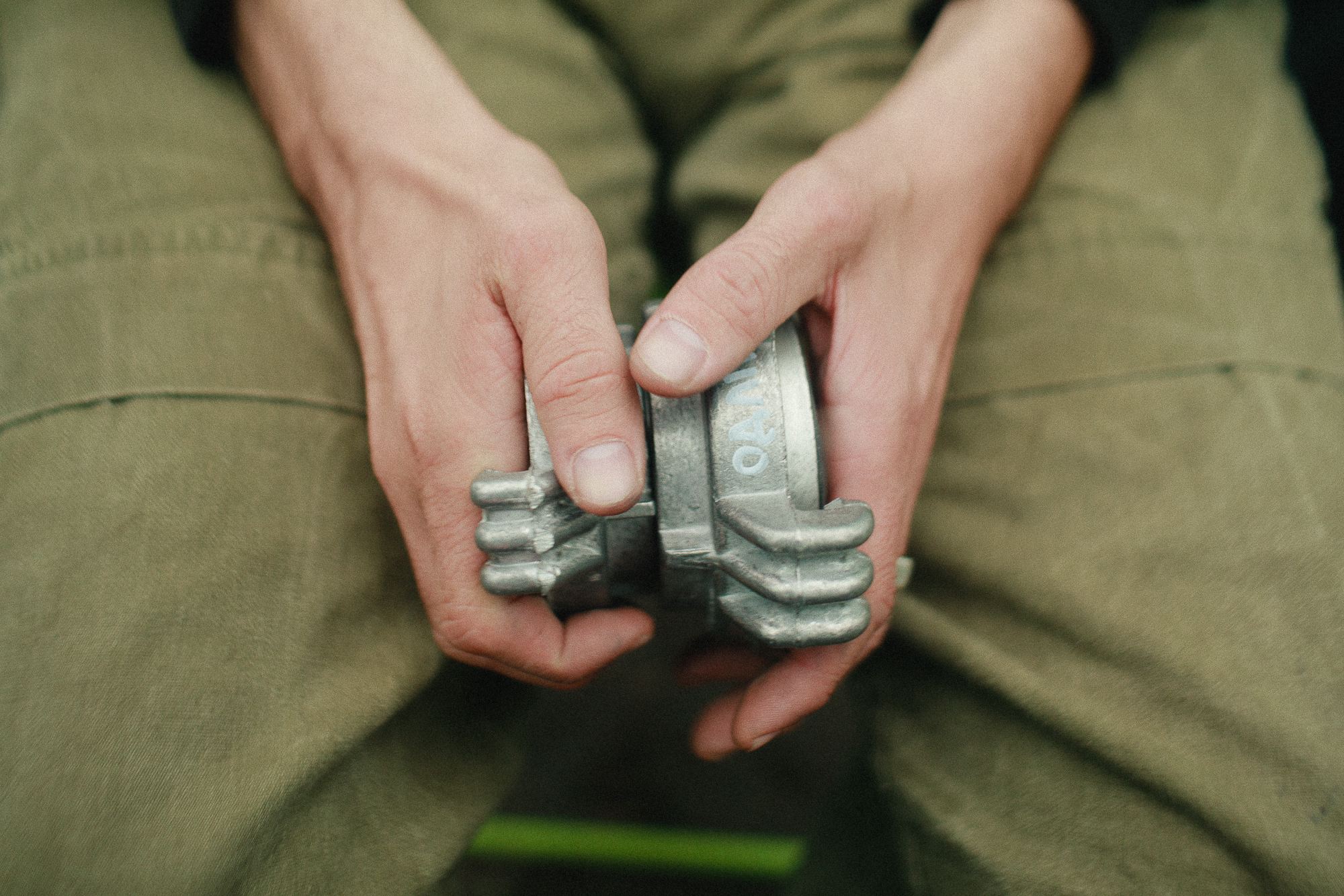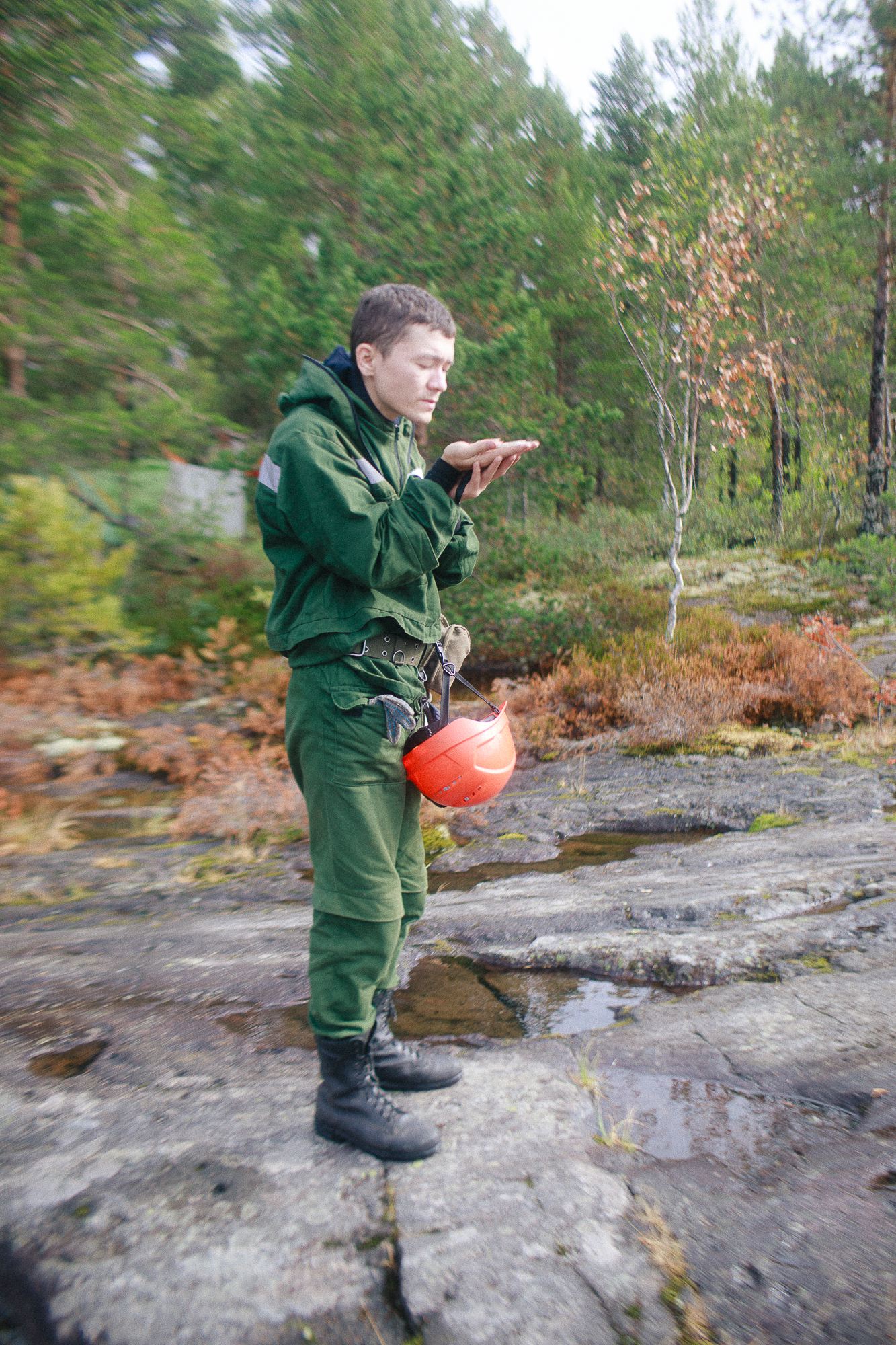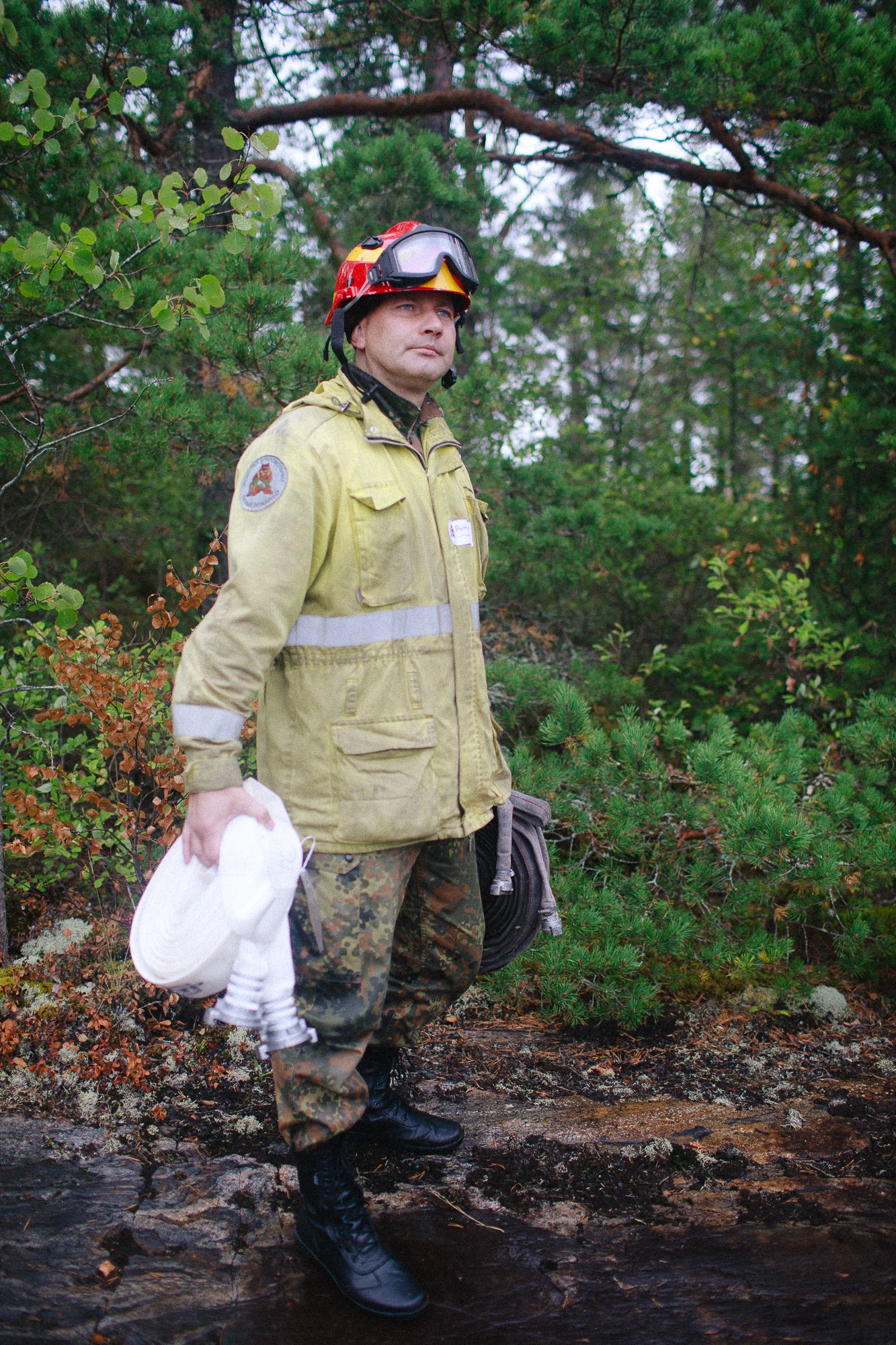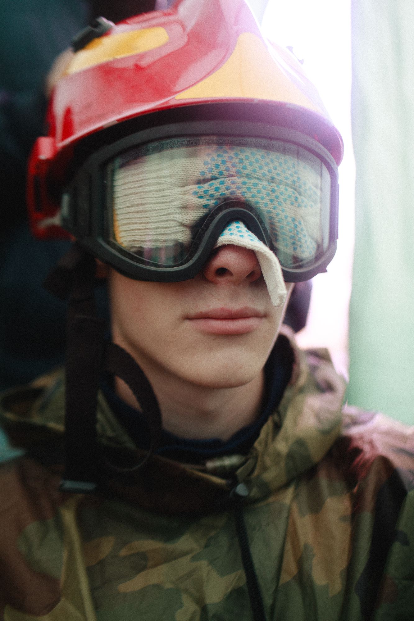 Иван на занятиях, в ходе которых новички должны только на ощупь понять, с каким пожарным оборудованием они работают