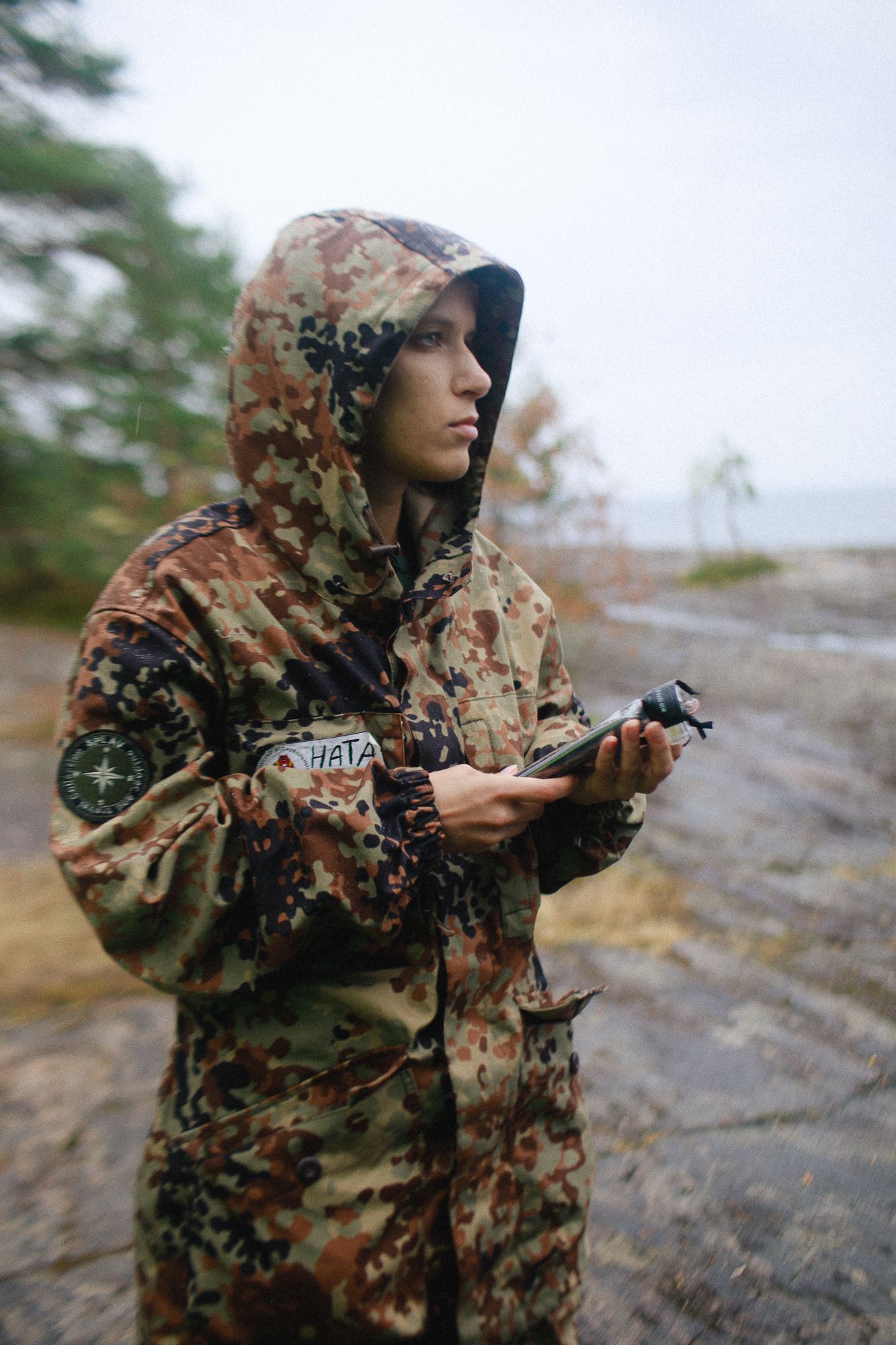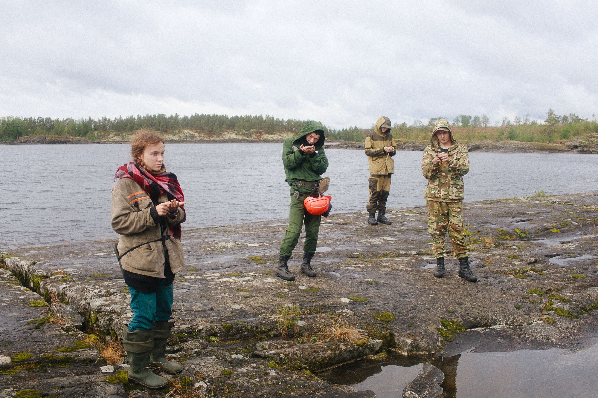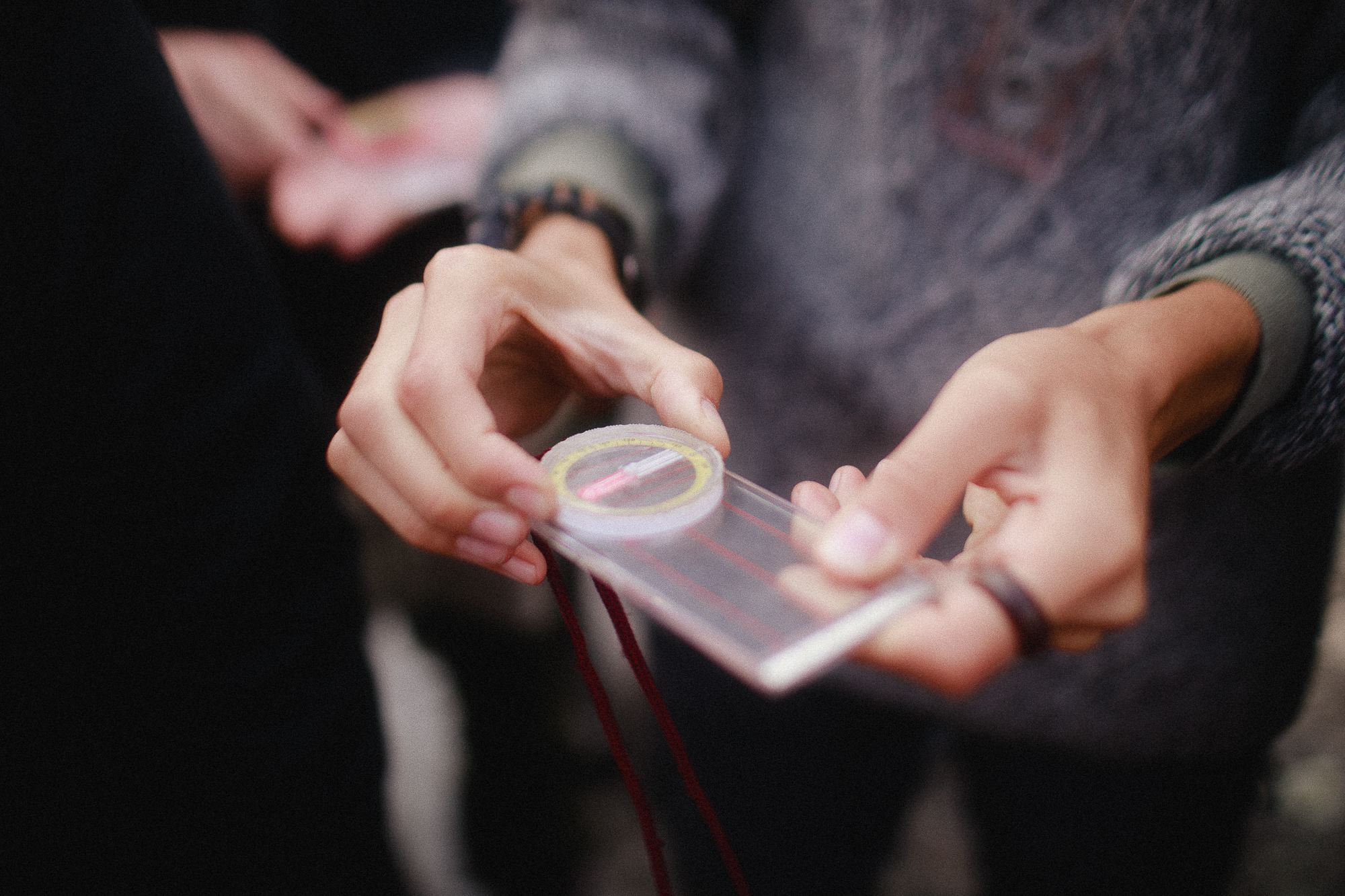 Новички учатся определять азимут по компасу для ориентирования на местности