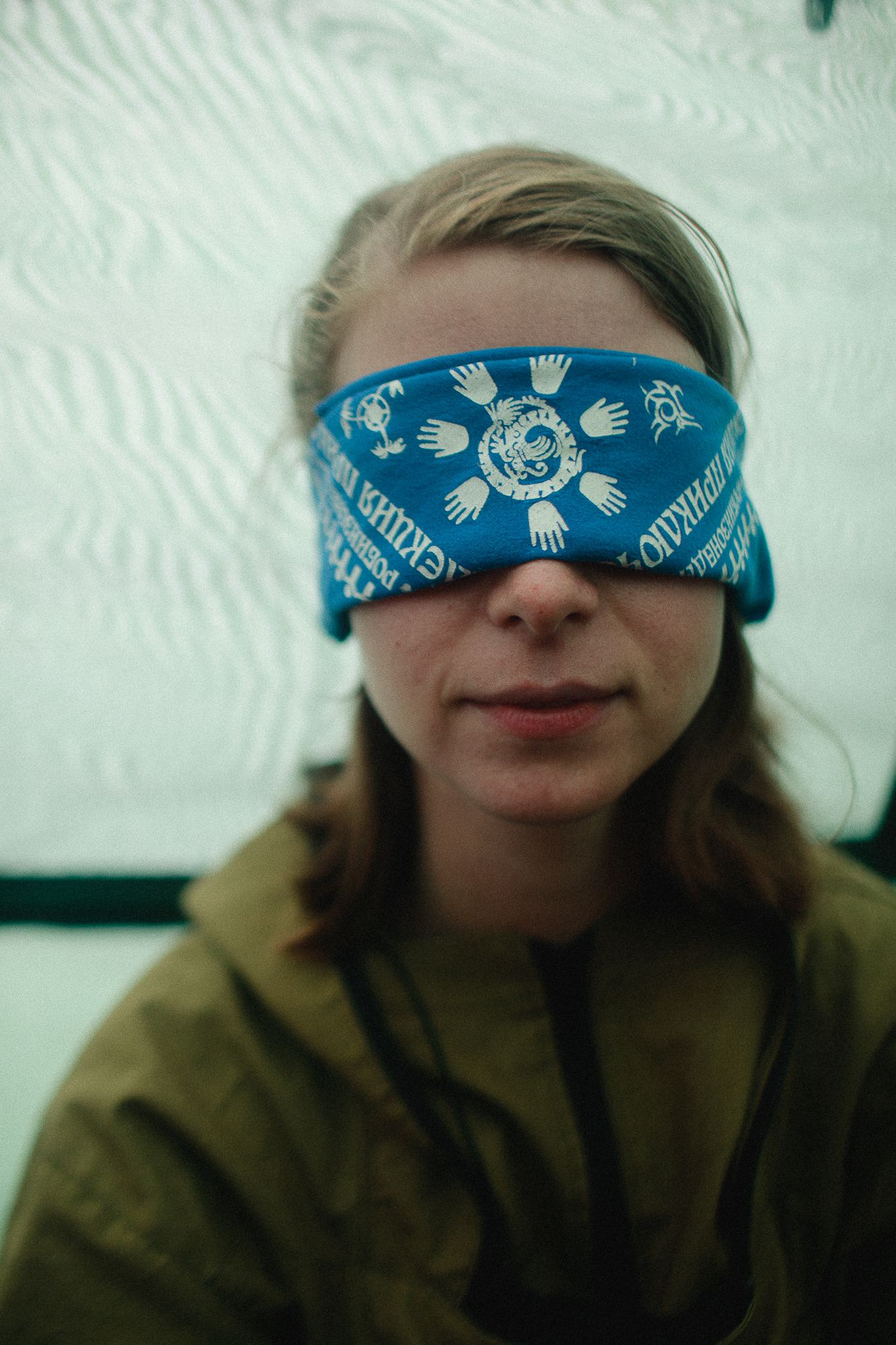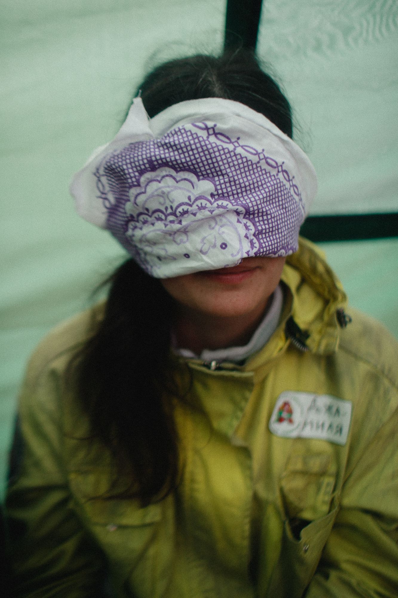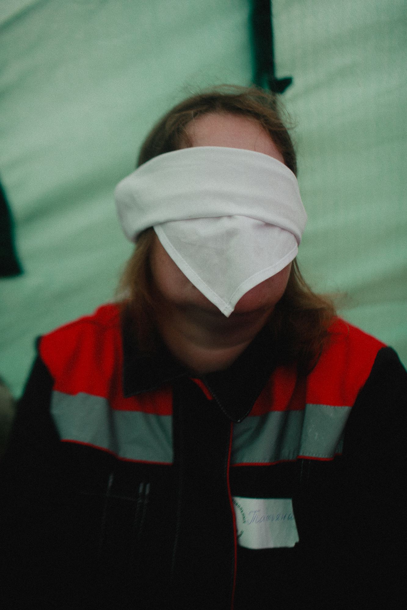 Полина на занятиях, в ходе которых новички должны только на ощупь понять, с каким пожарным оборудованием они работают