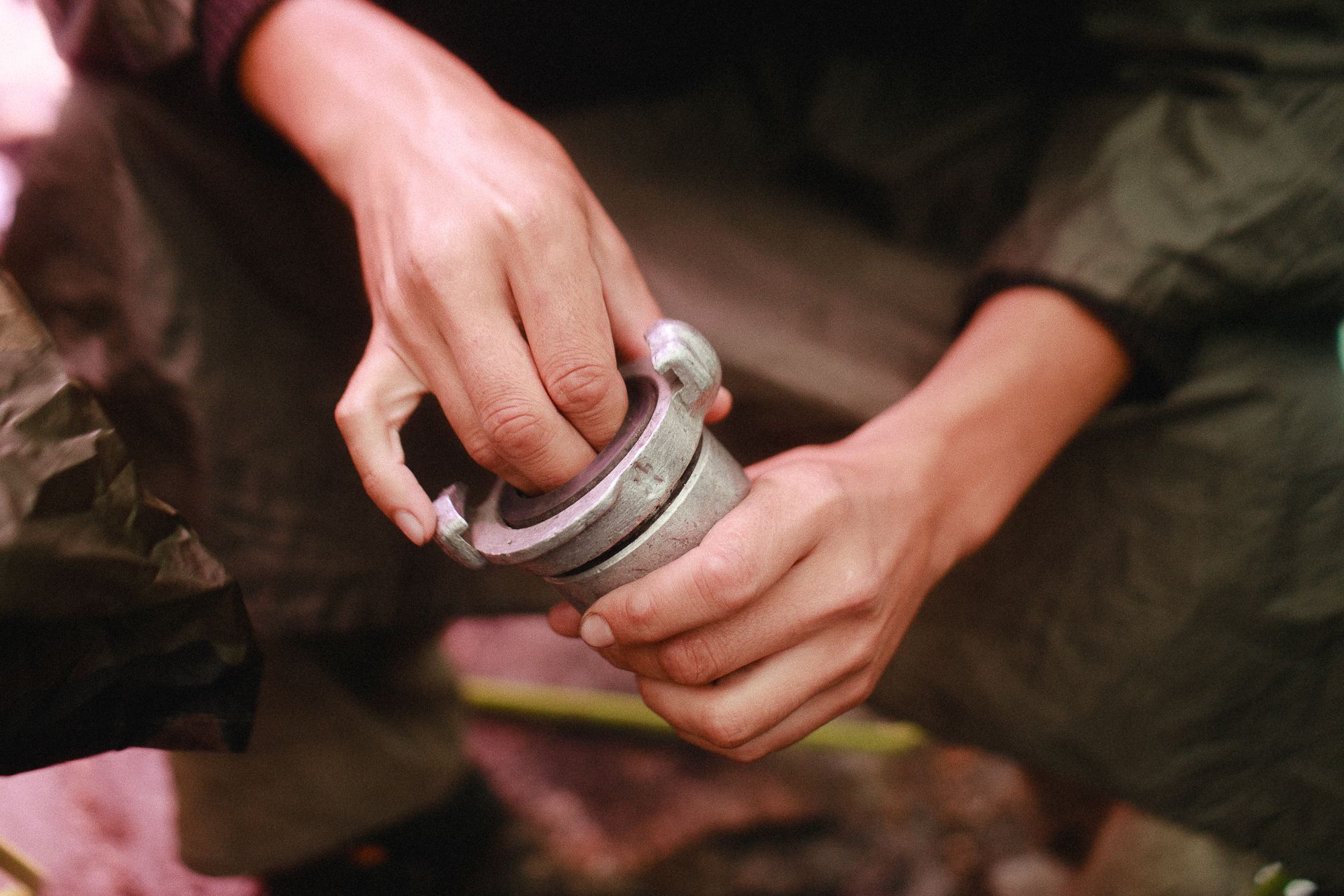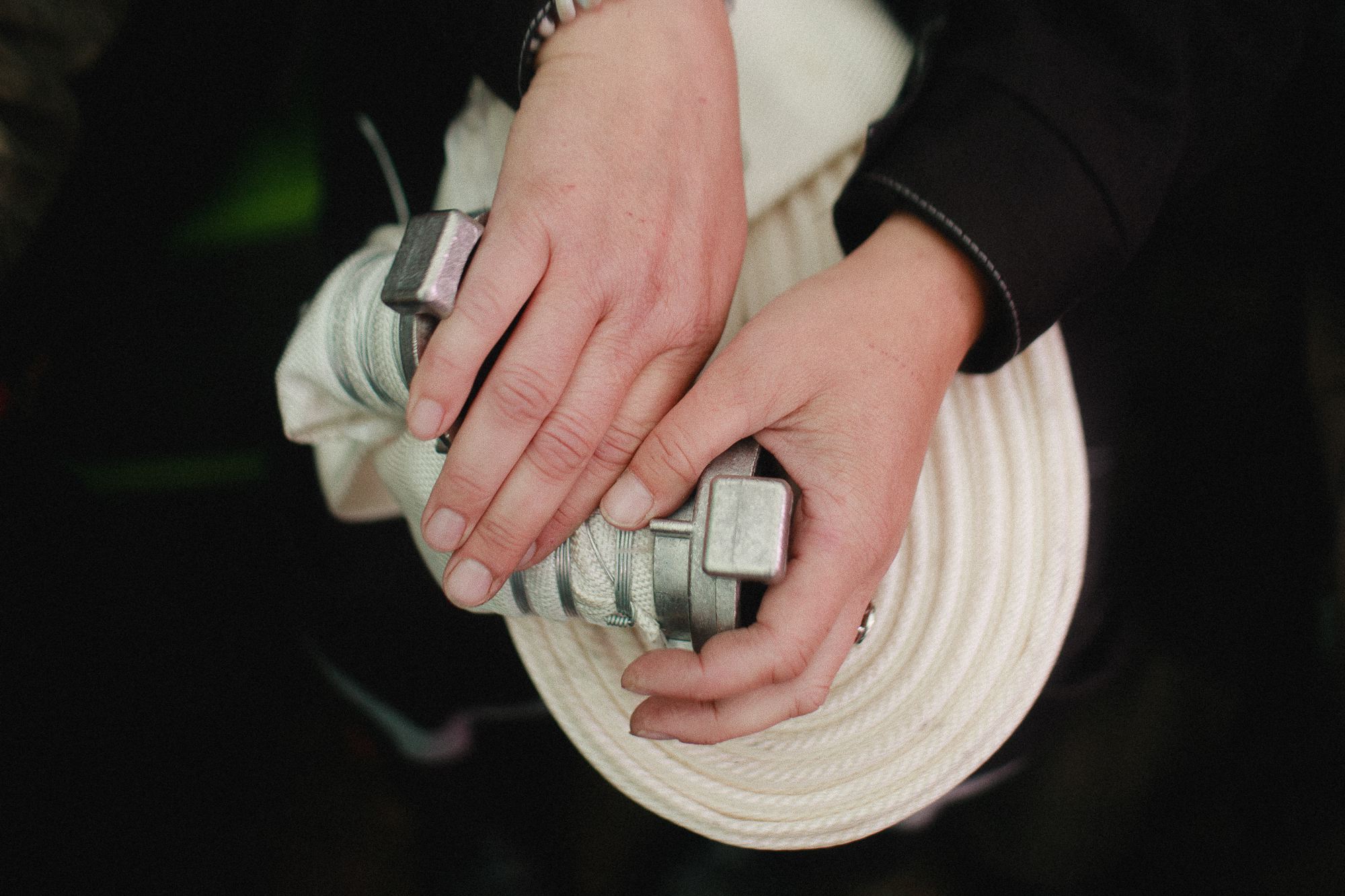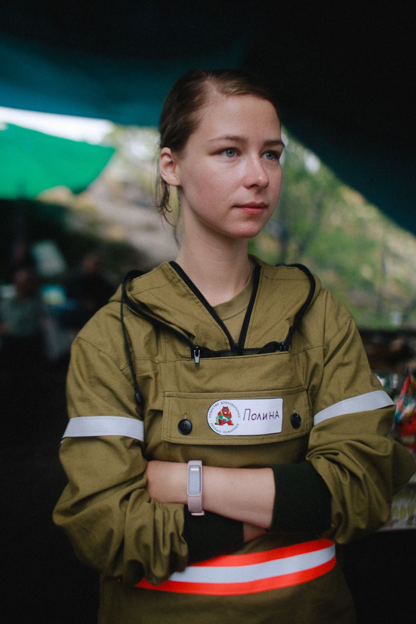 Полина на занятиях, в ходе которых новички должны только на ощупь понять, с каким пожарным оборудованием они работают