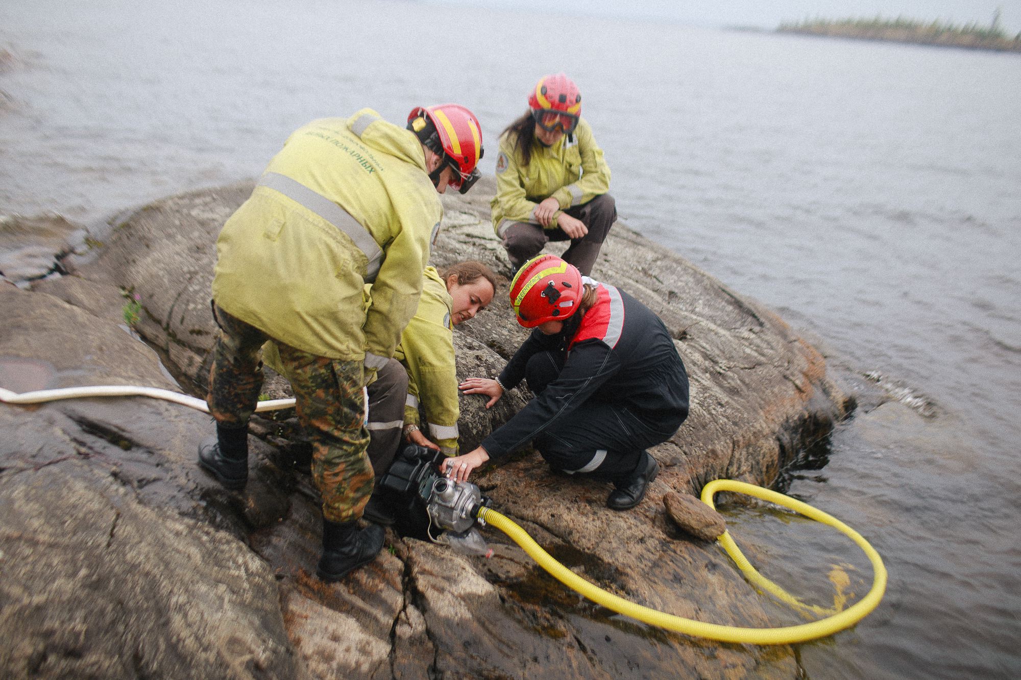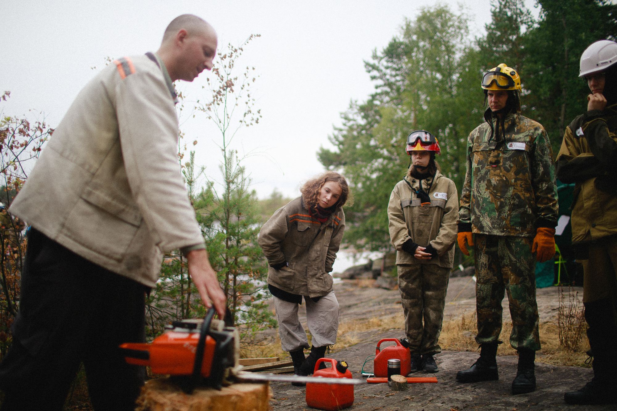 Анастасия на занятиях, в ходе которых новички должны только на ощупь понять, с каким пожарным оборудованием они работают