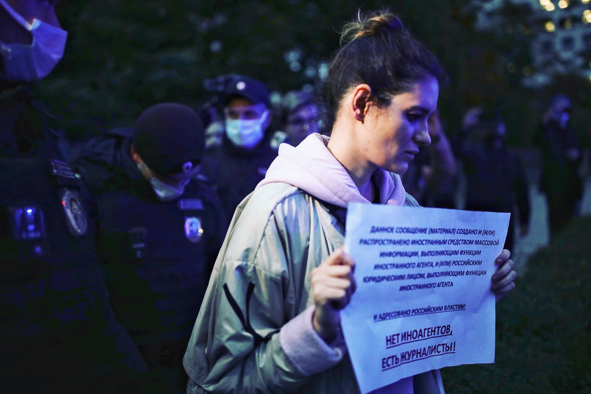 Evgeny Feldman / Meduza On the evening of September 8, Russian journalists took turns conducting solitary pickets against the labeling of independent media outlets as “foreign agents.” The protests took place outside of the Justice Ministry building in Moscow. Police made three arrests, detaining iStories journalists Alesya Marokhovskaya, Irina Dolinina, and Polina Uzhvak.