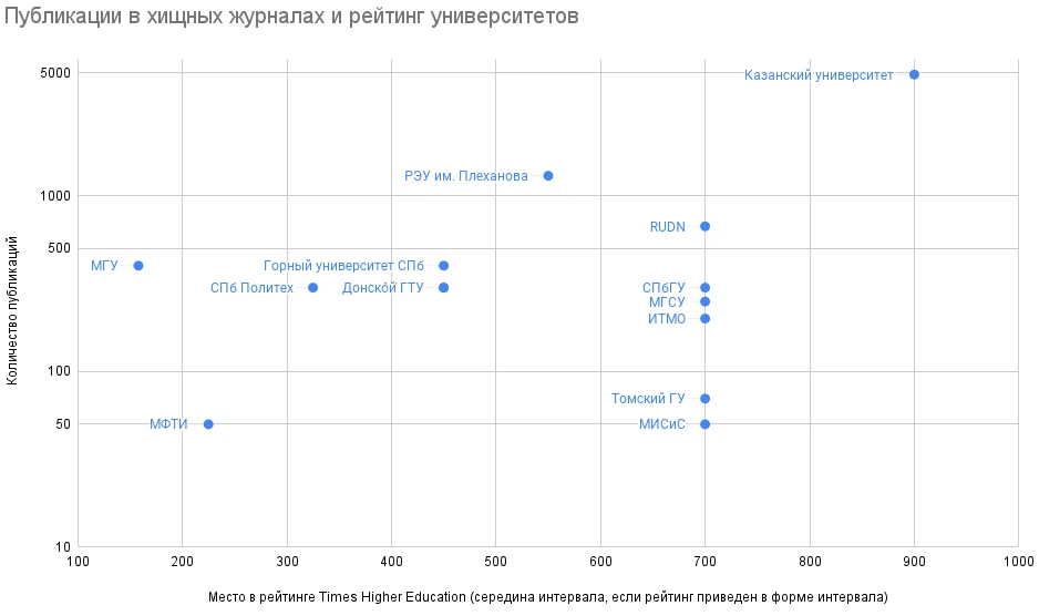 Насколько интенсивно указанные университеты участвовали в покупке публикаций в «хищных» журналах — показано на графике, составленном по данным «Диссернета». В основном добротные университеты (странным образом — кроме МГУ) пользовались услугами «хищников» гораздо меньше, чем те, появление которых в топе рейтинга вызвало вопросы. (ВШЭ, Томский госуниверситет и Новосибирский университет отсутствуют на графике, потому что для удобства мы сделали вертикальный масштаб логарифмическим, а в указанных трех вузах публикации в «хищных» журналах не были выявлены.)