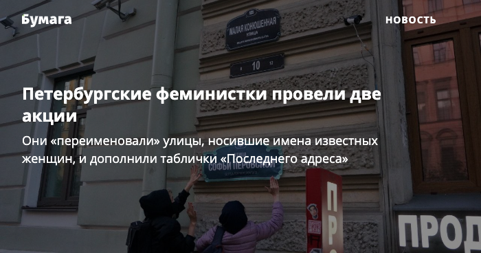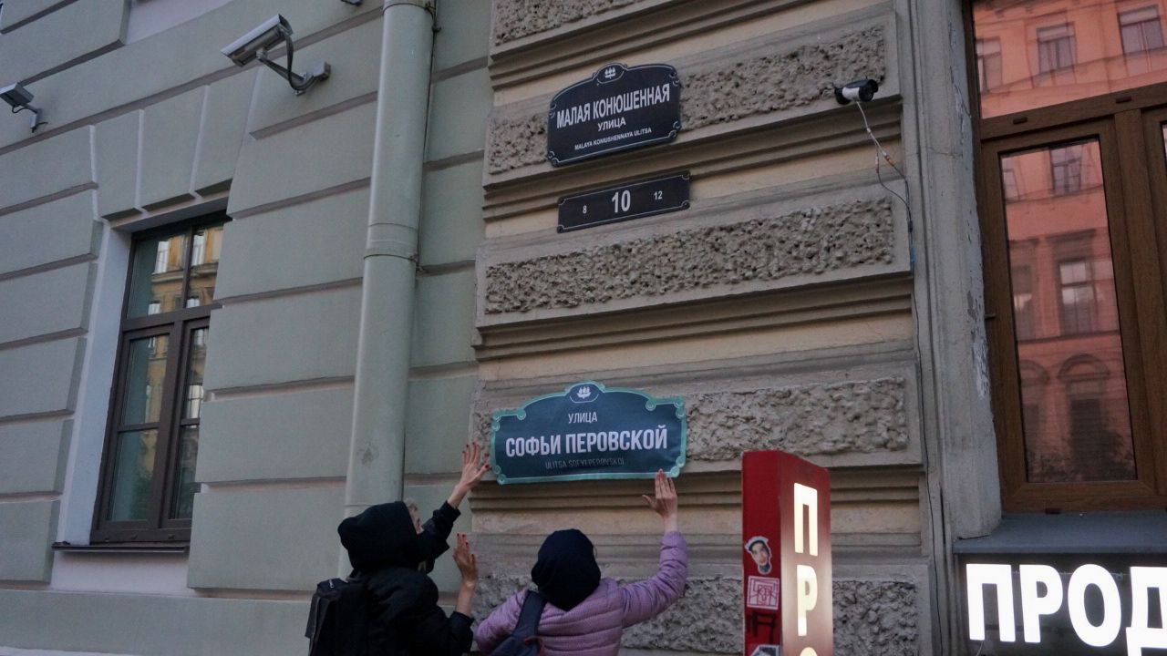 Девушки переименовали Малую Конюшенную улицу в улицу Софьи Перовской — в честь революционерки-народницы. Они также разместили новую табличку на 15-й линии Васильевского острова — когда-то она называлась улицей Веры Слуцкой.