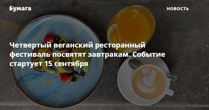 Четвертый веганский ресторанный фестиваль от телеграм-канала Utroo пройдет с 15 сентября по 15 октября, рассказали «Бумаге» организаторы. Тема события — завтраки.