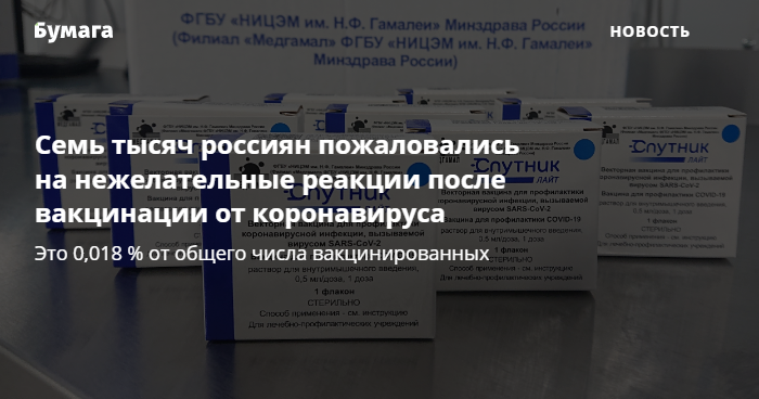 Самойлова рассказала, что 7 тысяч — это 0,018 % от всех вакцинированных в России. По ее словам, это значит, что на сегодняшний день нет информации, которая указывала бы на проблемы безопасности российских вакцин. Зафиксированные реакции и их частота, по словам Самойловой, не выходят за рамки инструкций по применению.