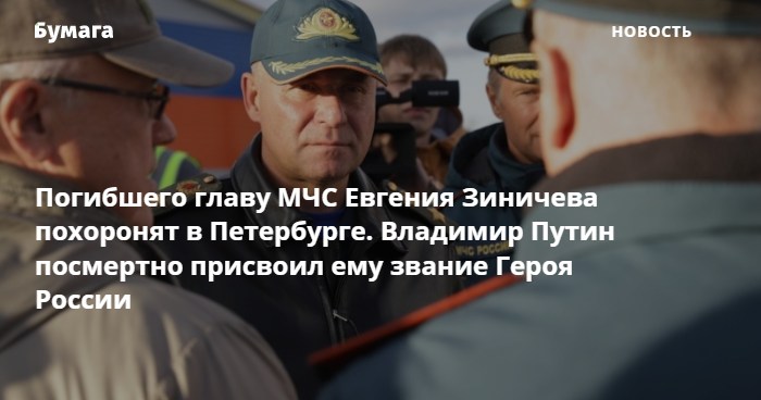Погибшего главу МЧС Евгения Зиничева похоронят в Петербурге. Владимир Путин посмертно присвоил ему звание Героя России