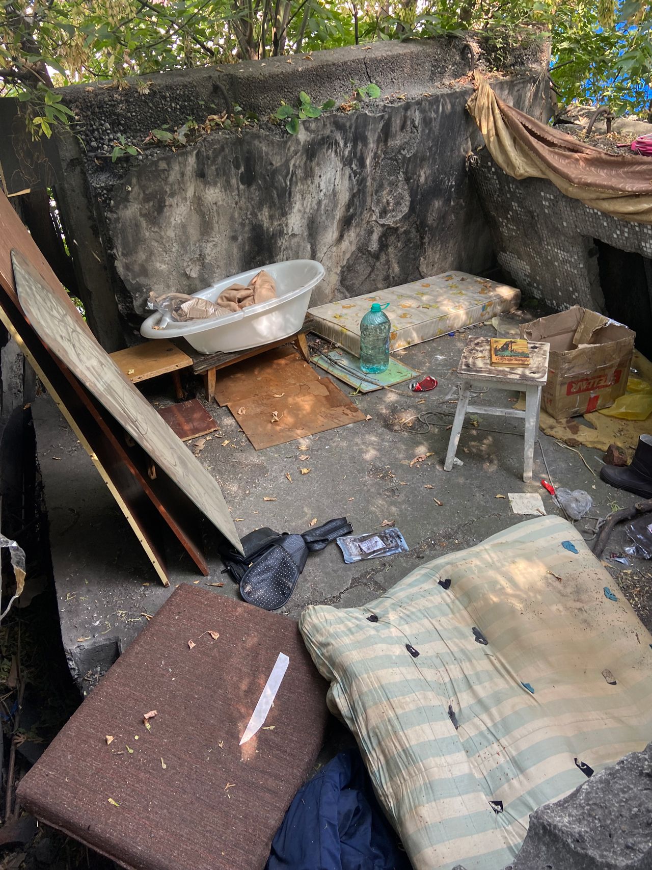 Очарованные такой добротой, дети даже позвали дядю Витю в свой шалаш во дворе настиного дома, в котором любили собираться. Этот шалаш сделан из груды наваленных и прислоненных друг к другу бетонных плит. Пробраться туда еще нужно умудриться — внутрь ведет очень узкая лазейка, пролезть в которую может только ребенок. Зато снаружи никому не видно, что происходит внутри. Для уюта дети притащили туда ненужные дома детские матрасы и всякий хлам: детскую ванночку, старые одеяла, спинки от диванов. Настя соорудила клетку и поселила туда голубя, которого назвала Гришей. А еще, к их радости, недавно кошка облюбовала детский закуток и родила там котят.