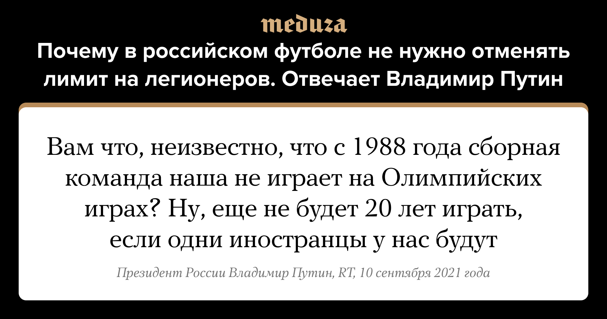 Футбольные специалисты уже давно призывают отменить лимит на легионеров, поскольку он искусственно ограничивает конкуренцию и приводит к завышению зарплат игроков с российским паспортом. Но у Владимира Путина совсем другое мнение, и обосновывает он его тем фактом, что футбольная сборная России ни разу не играла на Олимпийских играх. Вот только футбольный турнир на Олимпиаде далеко не самый престижный и далеко не самый сильный по составу команд. Главные футбольные турниры с участием сборных — это чемпионат мира и чемпионат Европы. Где Россия регулярно играет.