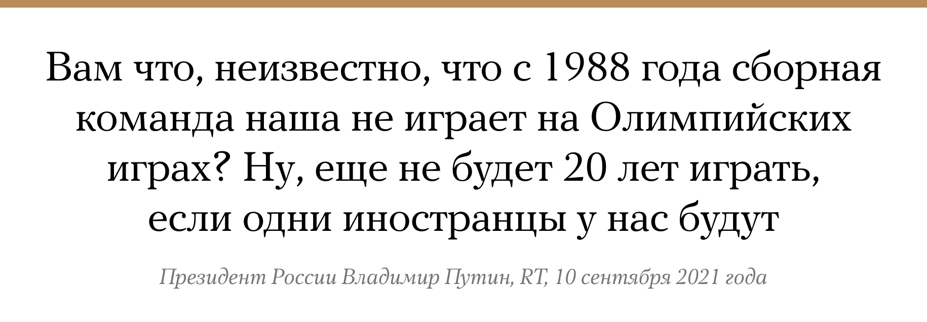 Президент России Владимир Путин высказался против отмены лимита на легионеров в российском футболе. В качестве аргумента он напомнил, что сборная России ни разу в новейшей истории не играла на Олимпийских играх (Олимпиады в футболе считаются намного менее престижными, чем чемпионаты мира и Европы, в которых Россия за это время в общей сложности участвовала 10 раз). Лимит на легионеров в российской премьер-лиге действует с 2005 года. Большинство специалистов полагают, что он идет во вред футболу — из-за искусственного ограничения конкуренции российские игроки снижают к себе требования и получают завышенные зарплаты. Возможность отмены лимита на легионеров рассматривается в рамках масштабной реформы российского футбола, которую Российский футбольный союз анонсировал на фоне все ухудшающихся результатов клубов в еврокубках.