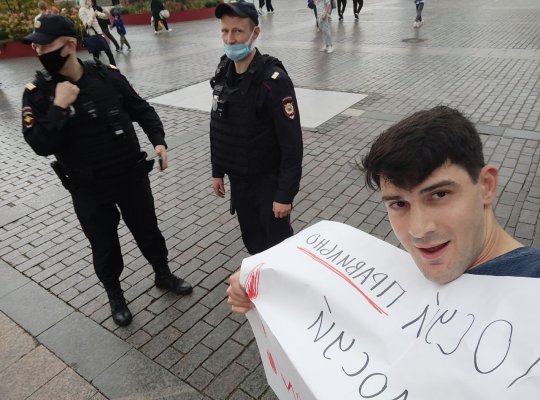 При задержании полицейские сказали Абгаряну, что он не имеет права стоять на этой территории. Пикетчика уже доставили в отдел полиции «Китай-город». К нему выехала адвокат от ОВД-Инфо Оксана Бородина.