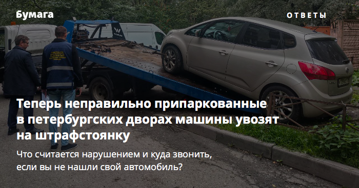 С начала этого лета в Петербурге выписывают штрафы водителям и увозят их машины на стоянку из-за неправильной парковки во дворах. В Смольном рассказали «Бумаге», что считается нарушением, достаточным для эвакуации, и куда звонить, если пропал автомобиль.