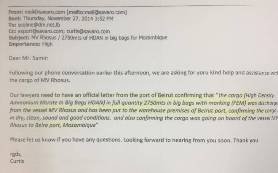 Связать Savaro Limited и Agroblend Exports с украинской сетью компаний Владимира Вербоноля журналистам удалось благодаря оказавшейся в их распоряжении электронной переписке. В одном из этих писем сотрудник Agroblend, подписавшийся как Кертис Инглхарт, в декабре 2013 года, уже после ареста Rhosus ливанскими властями, обращался за помощью к ливанскому предпринимателю. Он просил посодействовать его компании с получением доступа к арестованному грузу селитры и жаловался, что оператор судна, компания Teto Shipping, вымогает все новые и новые деньги на транспортные расходы.