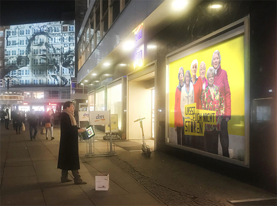 © apexart Ника Дубровская и Дэвид Грэбер (The Yes Women). Не берите нас в голову! 2019. Инсталляция в публичном пространстве. Александерплац, Берлин За лозунгом «Не берите нас в голову!» (нем. «Lasst Euch Nicht Stören») стоит исследование художницы Ники Дубровской и антрополога Дэвида Грэбера о разведенных женщинах в бывшей ГДР, пенсии которых были сокращены — фактически в наказание за статус разведенных — после объединения Германии. Как разведенные, эти женщины не получили компенсации, которая была положена замужним женщинам в ФРГ. При этом их также лишили поддержки, на которую они могли бы рассчитывать в социалистической ГДР. Вот уже 30 лет эти женщины борются за свои права, задействуя все возможные политические и законодательные рычаги. Они даже добились постановления ООН, осуждающего действия по отношению к ним. Немецкое правительство остается непреклонным, постоянно откладывая принятие решения по этому вопросу и, по сути, ожидая смерти этих женщин. Тридцать лет назад их было 800 000 человек. Сегодня осталось около 300 тысяч. Чтобы привлечь внимание к беспрецедентной несправедливости правительства по отношению к собственным гражданкам и сделать их движение за свои права более видимым, Ника и Дэвид основали художественную группу The Yes Women. Она объединяет художников, исследователей и активистов, которые в своих работах анализируют текущее состояние западной демократии.