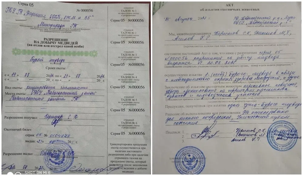 В распоряжении «Новой газеты» имеются копии акта об изъятии охотничьих животных и разрешения на добычу медведя.