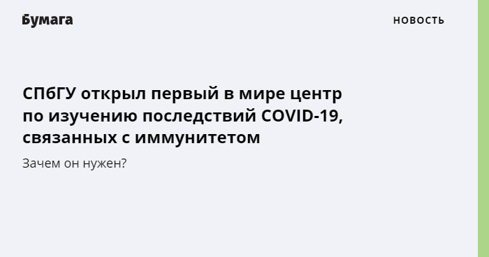 СПбГУ открыл первый в мире центр по изучению аутоиммунных заболеваний и последствий COVID-19. Он располагается на базе клиники высоких медицинских технологий имени Пирогова СПбГУ, сообщили «Бумаге» в вузе.