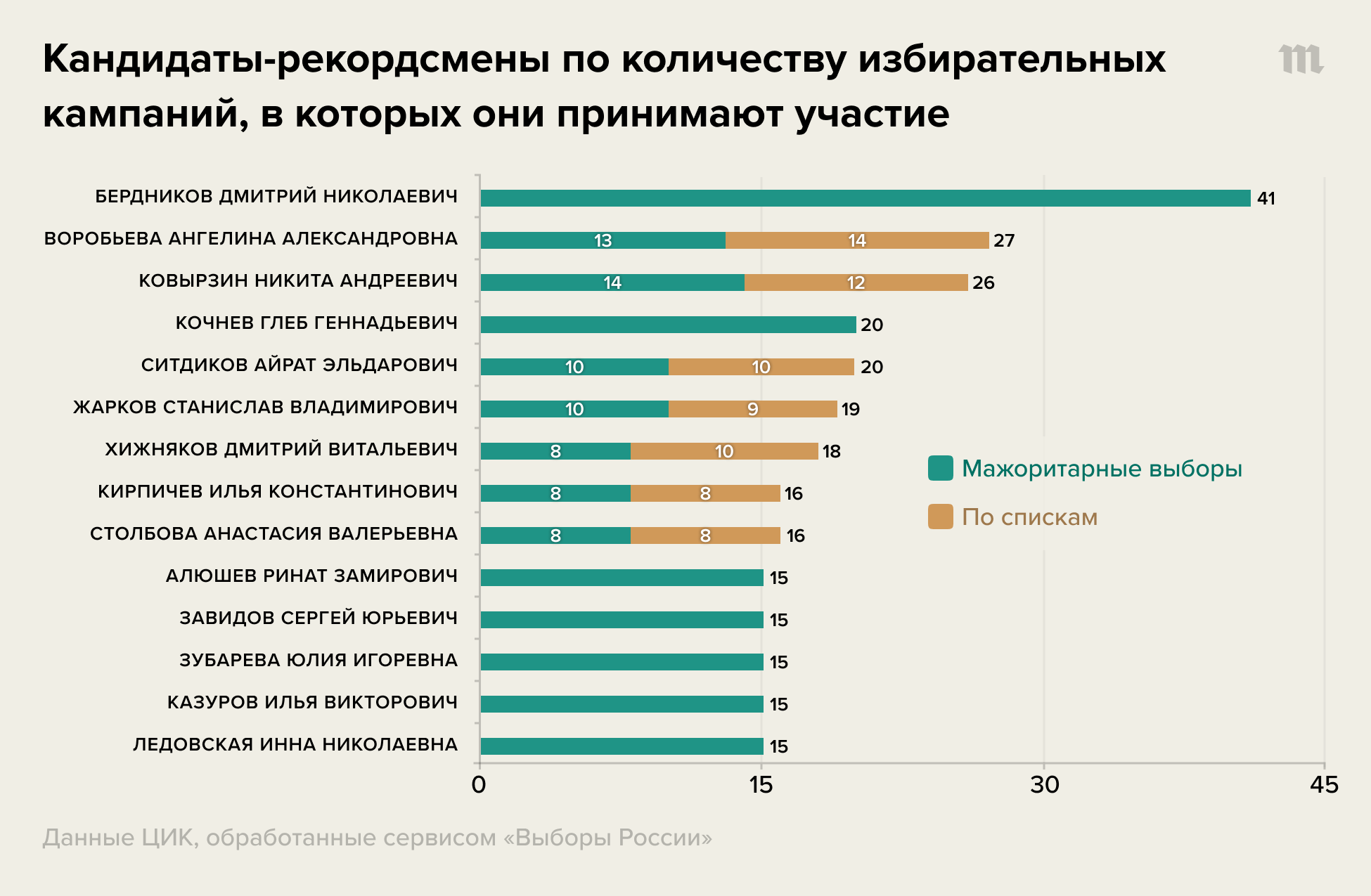 Чтобы все-таки сопоставить информацию, Богачев и его команда скачали весь массив данных с сайта Центризбиркома, обработали его и составили список россиян, участвовавших больше чем в одной избирательной кампании одновременно. Таких кандидатов они назвали «серийными».