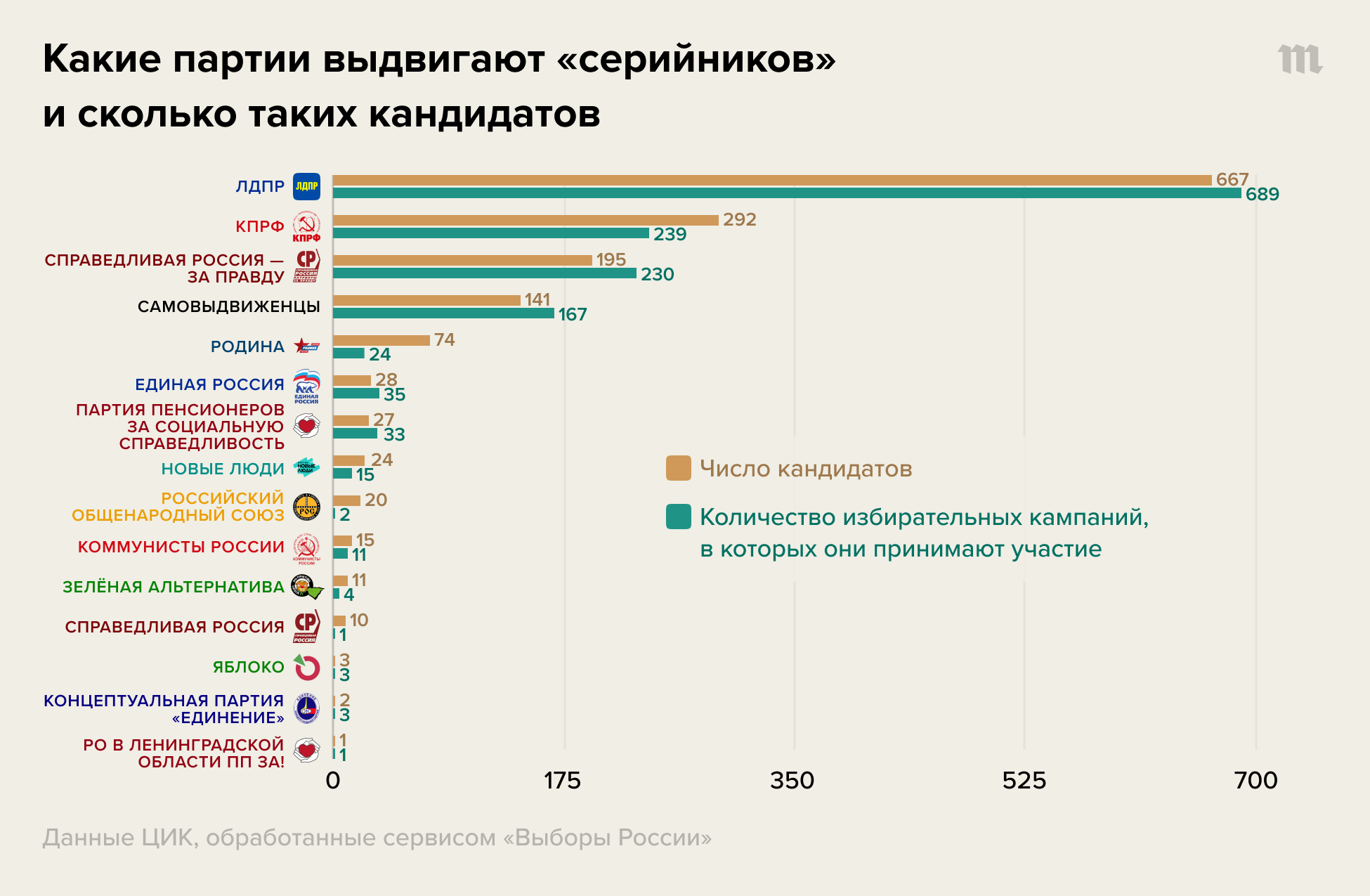 Проанализировали исследователи и сентябрьские выборы 2021 года. Среди кандидатов в депутаты Госдумы, которых выберут 17–19 сентября, «серийных кандидатов» они не нашли. Зато обнаружили 995 человек, участвующих в местных выборах по одномандатным округам. А с учетом тех, кто идет по партийным спискам, их число и вовсе приближается к 1500.