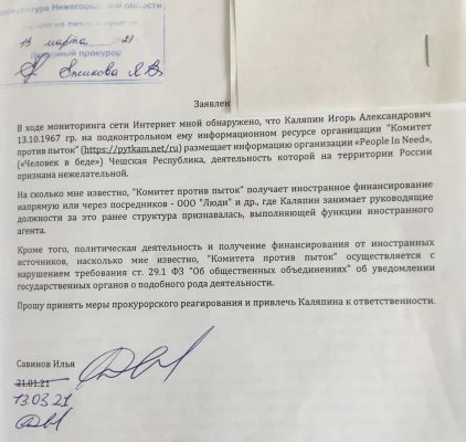 Российские власти признали НПО «Человек в беде» «нежелательной организацией» в 2019 году, однако поводом для составления протокола на Каляпина стали скриншоты с сайта КПП от 2015, 2016 и 2017 годов. Прокуратура заинтересовалась публикациями КПП после жалобы «борца с оппозицией» Ильи Савинова.