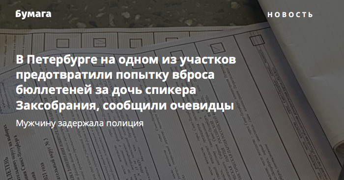 Как уточнил «Бумаге» член территориальной избирательной комиссии № 9 с правом совещательного голоса Даниил Кен, который был свидетелем описанных событий, это произошло около 11 утра. Попытку вброса заметил член комиссии от одного из кандидатов в муниципальные депутаты, рассказал Кен. О личности задержанного ему ничего не известно.