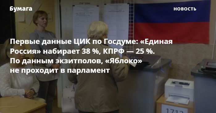 Появились первые данные ЦИК о результатах выборов в Госдуму — по итогам подсчета 9 % голосов. Согласно ним, «Единая Россия» набрала 38,68 %, КПРФ — 25,11 %, ЛДПР — 9,59 %, «Новые люди» — 7,89 %, «Справедливая Россия — Патриоты — За правду» — 6,66 %.